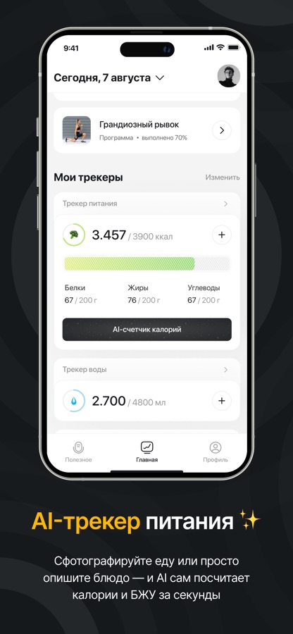 СТАТИСТИКА. Вести расчеты — утомляющая рутина. Этим займётся умный алгоритм приложения FKN: нормы КБЖУ, воды и потребления калорий. Все цифры учитывают ваши индивидуальные особенности, а благодаря поддержке Apple Health приложение автоматически считает шаги.
