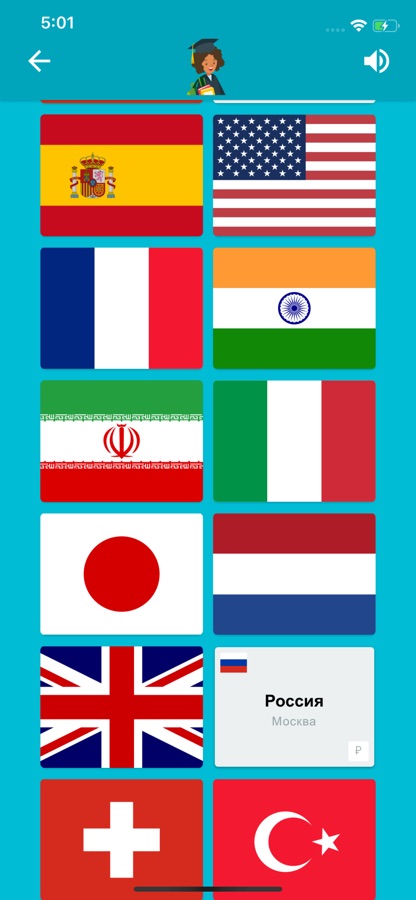 Угадайте название страны среди 4 флагов или правильный флаг среди 4 стран. Нет беспорядочной механики. Дизайн прост и современен.