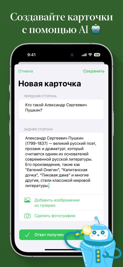 Откройте новый способ обучения с нашим продвинутым приложением для создания карточек с помощью ИИ. Готовитесь к экзаменам, осваиваете новые темы или просто структурируете информацию? Моё приложение сделает этот процесс максимально простым и удобным. Интуитивный интерфейс позволит Вам легко создавать и упорядочивать карточки. А для людей, которые предпочитают визуальное обучение предусмотрена возможность добавлять изображения к карточкам. Flash идеально подходит как для студентов, так и для профессионалов — с этим инструментом Вы сможете достичь успеха в любой сфере.