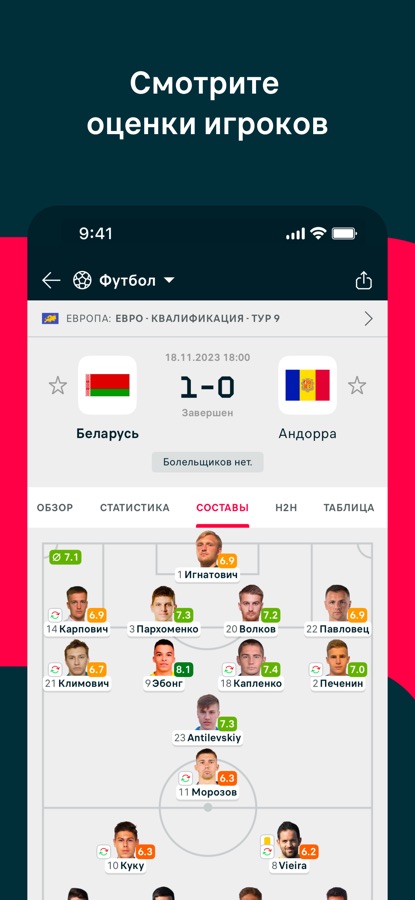 • УВЕДОМЛЕНИЯ И НАПОМИНАНИЯ: на начало матча, состав, голы — вы не пропустите ни одно событие. Просто выберите ваши любимые матчи и подождите, пока ваш телефон сообщит вам о важном событии в матче.