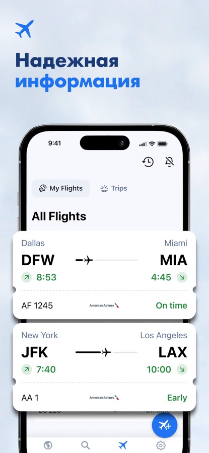 ⁃ получить доступ к детальной информации о вашем рейсе: точному времени прибытия и отправления, номеру нужного вам терминала и стойки регистрации, расстоянию, длительности полета и оставшемуся в пути времени. Приложение поддерживает более 850 авиакомпаний. Используя его, вы всегда будете владеть всей необходимой информацией: