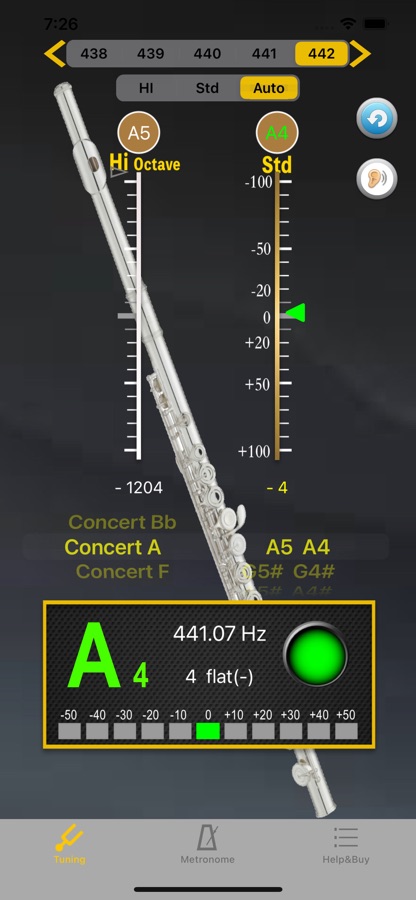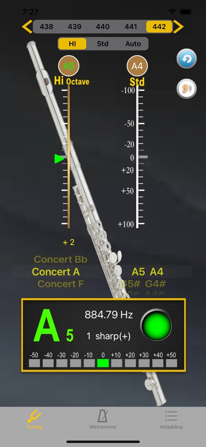 Первый шаг — выберите частоту в верхней части экрана, затем выберите настройку в середине экрана. Когда вы играете на инструменте, высота звука будет отображаться на панели с указанием высокого или низкого уровня сигнала.