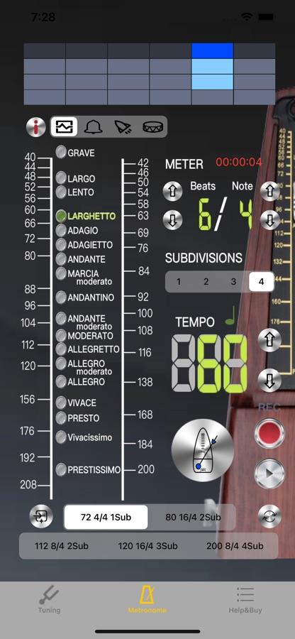 — Интуитивно понятный выбор режима ударов, 18 типов, в том числе: Могила 25-45 / Ларго 40-60 / Ленто 45-60 / Ларгетто 60-66 / Адажио 66-76 / Адажиетто 72-76 / Анданте 76-108 / Андантино 80- 108 / Marcia moderato 83-85 / Andante moderato 92-112 / Moderato 108-120 / Allegretto 112-120 / 116-120 / Allegro 120-156 / Vivace 156-176 / Vivacissimo 172-176 / Presto 168-200 / Prestissimo 200 ударов в минуту и более