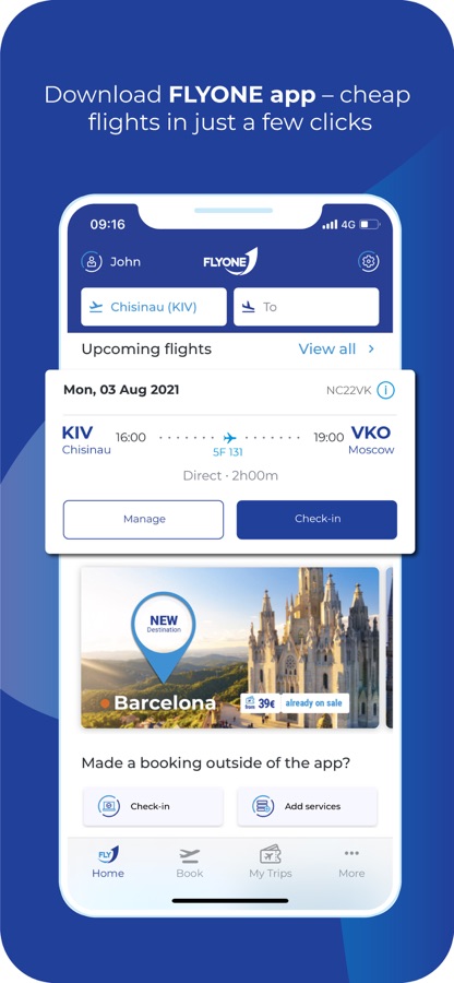 Download the FLYONE app — an interactive, intuitive and user-friendly platform for booking flights, checking in, receiving discounts, using vouchers and testing other smart options.
