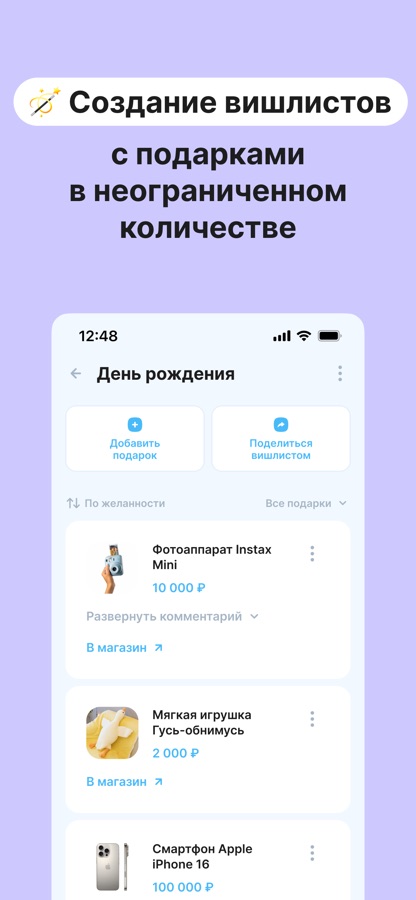 Добавляй нужные подарки с ссылками на интернет-магазины