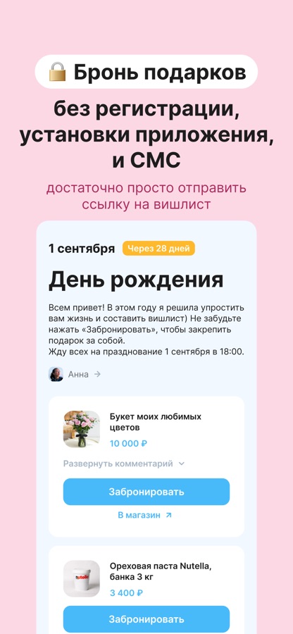 Отправь им ссылку и каждый сможет забронировать подарок из списка без установки приложения, регистрации и смс