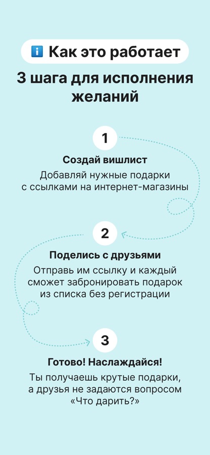 — Гибкие настройки конфиденциальности и бронирования. Выбери, хочешь ли видеть забронированные подарки, кому будет доступен твой вишлист и кто сможет бронировать в нем подарки