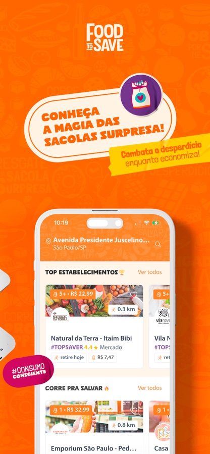 A Food To Save é o app nº1 no combate ao desperdício de alimentos no Brasil. Conectamos você a estabelecimentos que transformam excedentes de produção em Sacolas Surpresa cheias de sabor, propósito e economias incríveis.