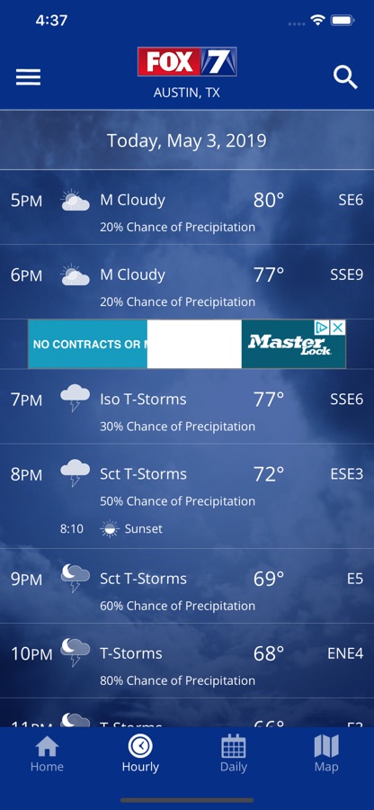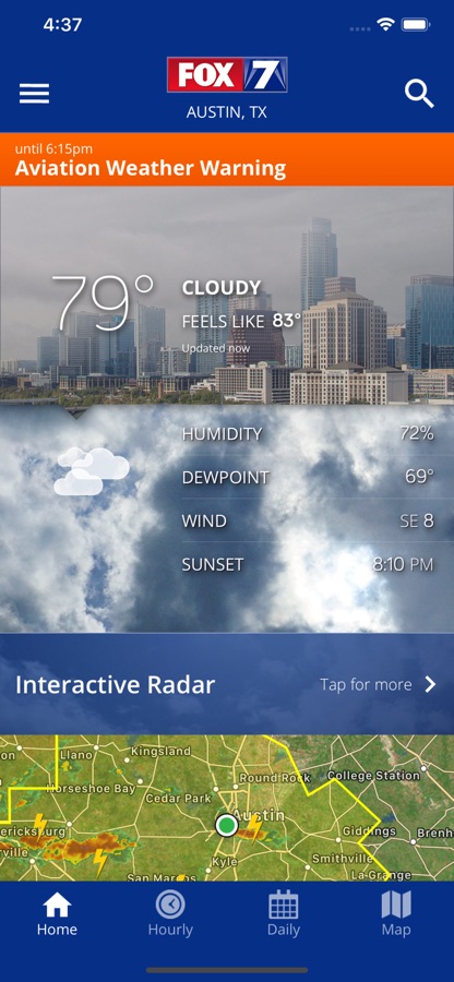 Track your local forecast for the Austin area quickly with the free FOX 7 WAPP. The design gives you radar, hourly, and 7 day weather information just by scrolling. Our weather alerts will warn you early and help you stay safe during storms.