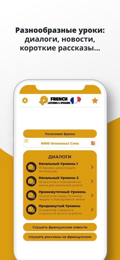 «Учить Французский — Слушать и Говорить» одно из развивающихся приложений PORO для самообучающихся, которые хотят легко и эффективно общаться на французском языке. 750 повседневных диалогов, список уроков с различной тематикой от поздравления, совершения покупок, работы, семейного разговора и т.д. Подходит для всех изучающих французский язык − от начинающего до среднего и продвинутого, чтобы практиковаться в общении на французском языке.