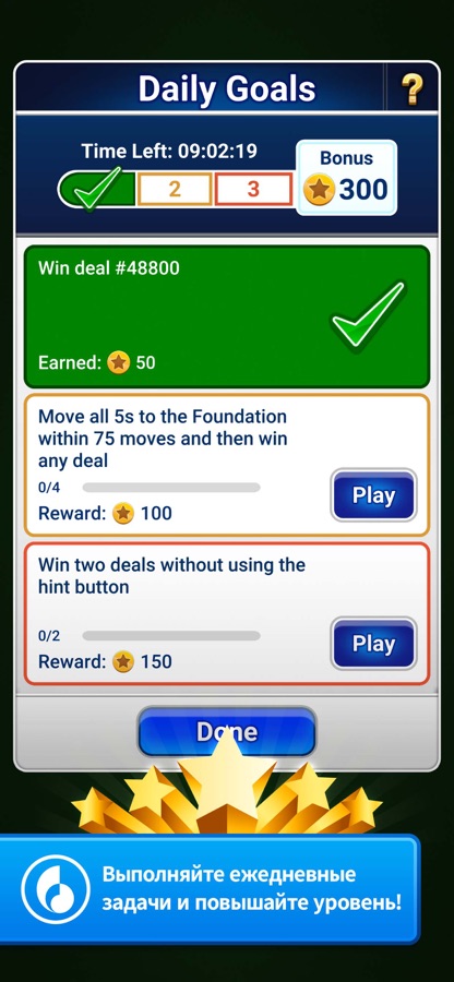 В игре FreeCell имеются цели и улучшенная система счёта, включая личные рекорды! Каждый день выдаётся задание, за выполнение которого полагается опыт, а за повышение уровня можно получить новые титулы!