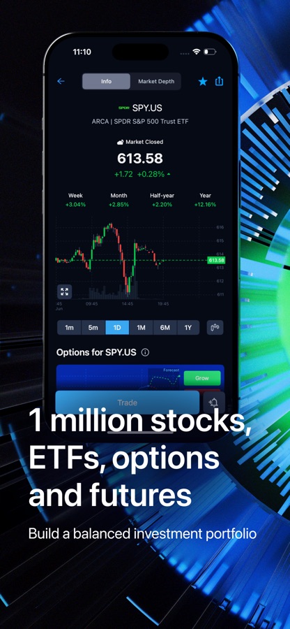 Создайте сбалансированный и ликвидный портфель активов, инвестируя в более чем 1 миллион акций, ETF, облигаций и опционов на 15 мировых фондовых биржах в США, Европе и Азии.