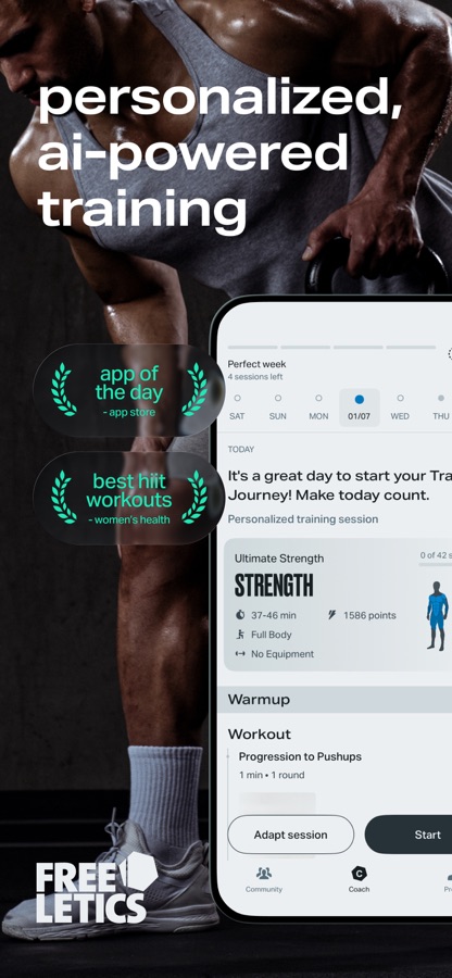 Фитнес-приложение #1 в Европе позволяет тренироваться где и когда угодно с цифровым персональным тренером, без необходимости посещать зал. Независимо от уровня подготовки, формируй здоровые привычки и достигай целей быстрее с персонализированным фитнес-планом, адаптированным под тебя. Добавляй кардио, тренировки с весами, тренажеры, интервальный бег, или выбирай классику Freeletics с тренировками HIIT и калистеникой с собственным весом. Каждый тренировочный план включает полностью персонализированные тренировки с разминкой, заминкой, сессиями мобильности и восстановления, чтобы быстрее достигать целей.