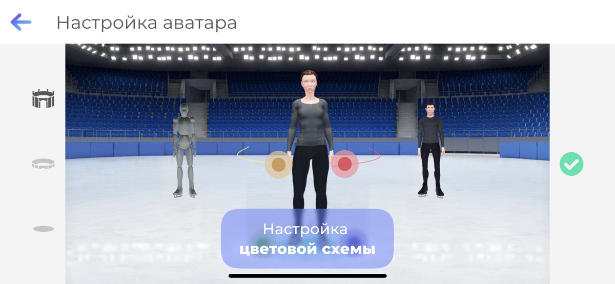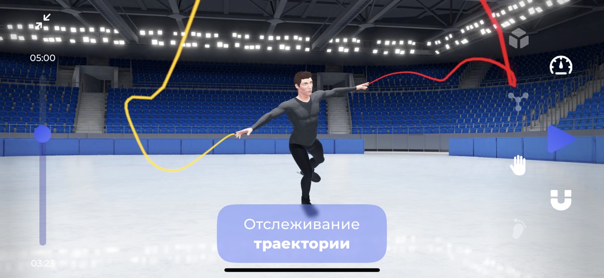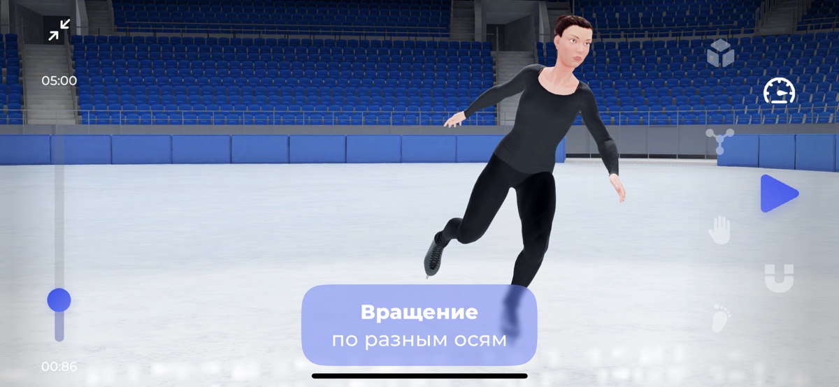 Вы можете выбрать из трех различных видов настроек окружения: лед, каток и ледовый дворец. По умолчанию, камера следует за моделью, но вы можете это изменить и посмотреть на исполнение прыжка под другим углом, например со стороны тренера, болельщиков или судей.