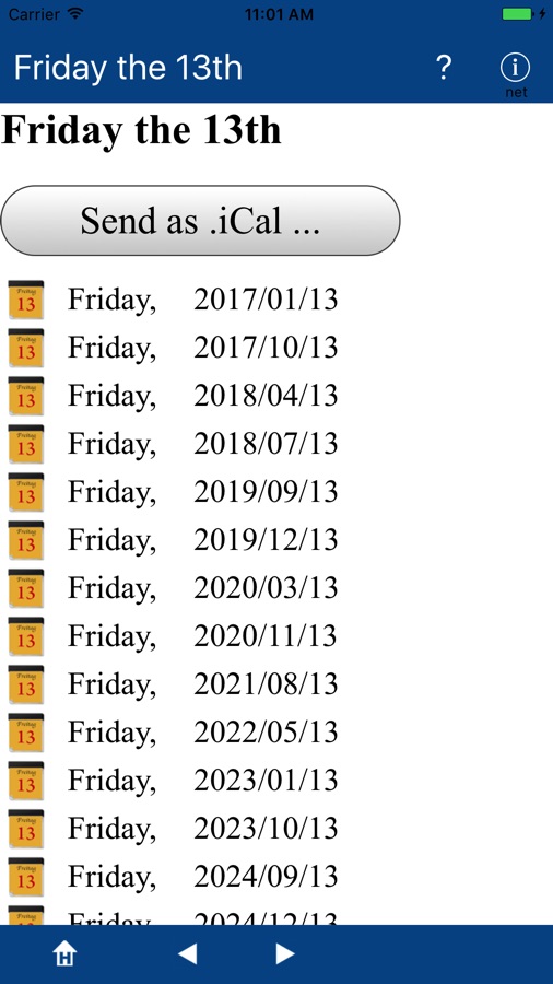 Every year one to three fridays fall on a 13th. For everyone this day has a other relevance. This program calculates all fridays the 13th for the next 50 years. With the .iCal-function you can enter these days in the calendar of the PC, Mac and the device.