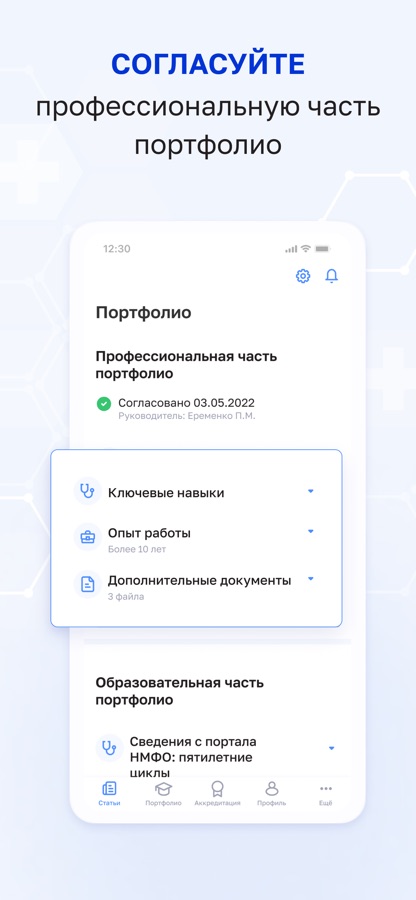 Мобильное приложение позволит сформировать заявление на аккредитацию, включая образовательную и профессиональную части портфолио, загрузить подтверждающие документы, своевременно отследить статусы согласования портфолио и заявлений.