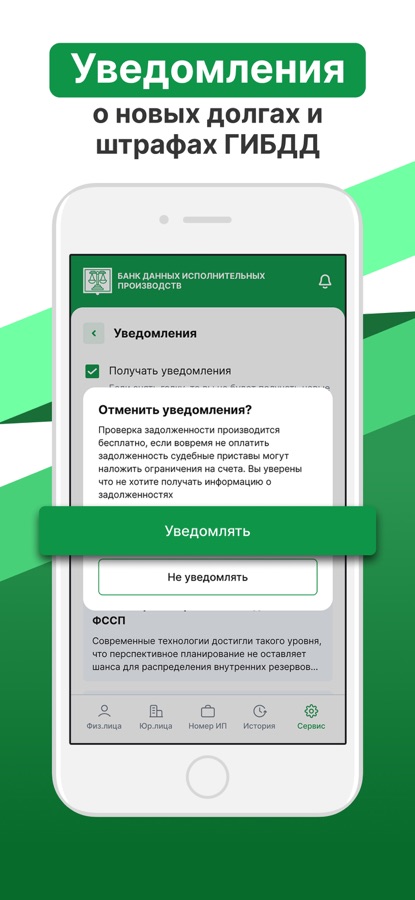 С полным доступом к ФССП России личного кабинета вы сможете регулярно отслеживать новые начисления задолженностей по документам и фамилии. Мы регулярно будем направлять пуш уведомления если у Вас в личном кабинете ФССП России будет найден новый УИН (уникальный идентификатор начисления). Благодаря своевременным напоминаниям о штрафах ГИБДД вы сможете их оплачивать с 50% скидкой.