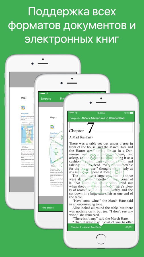 * Поддерживается работа с документами(*.djvu, *.pdf, *.xps),