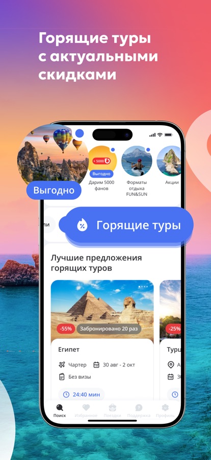 Оцените все преимущества приложения FUN&SUN, путешествуя с нами по России и другим странам мира. Выбирайте горящие туры в любимые страны, отели и гостиницы с лучшими видами и с легкостью осуществляйте бронирование отелей, приобретайте билеты на самолет, подходящие именно вам. Подберем для вас дешевые авиабилеты и горящие путевки в специальной подборке со скидками до 70%!