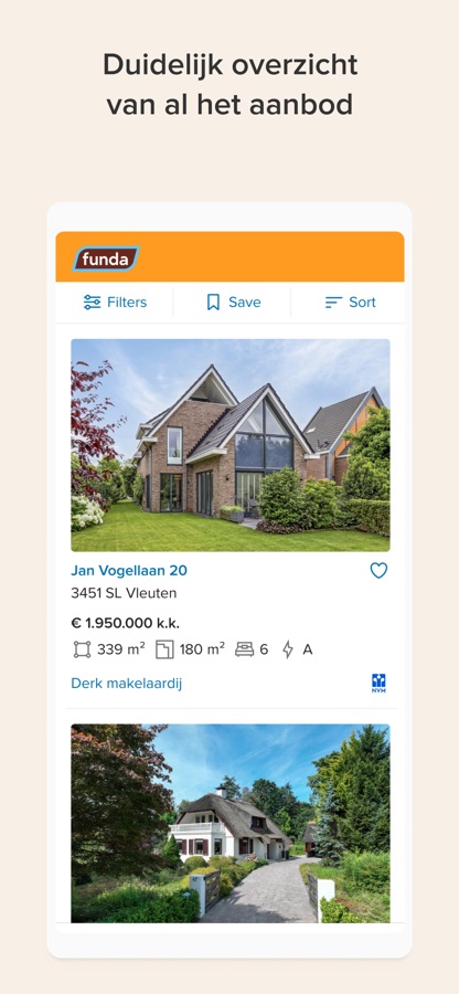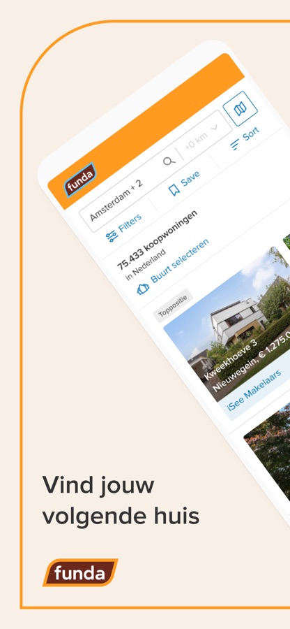 Dé app om je toekomstige koop-, huur- of nieuwbouwhuis te zoeken. Bekijk onderweg of thuis vanaf de bank het hele woningaanbod op Funda. Kijk even rond bij huizen in de buurt – of die van je buren ;) –, doe leuke ideeën op voor je eigen woning of word op slag verliefd op je toekomstige stekje.