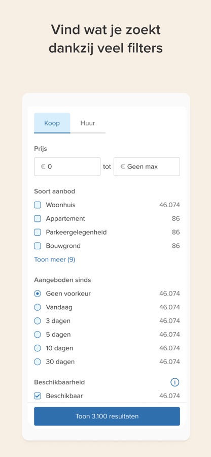 Je kunt al je persoonlijke voorkeuren instellen in je zoekopdracht, zodat je in de lijst of op de kaart alleen huizen ziet die écht bij jouw woonwensen passen.