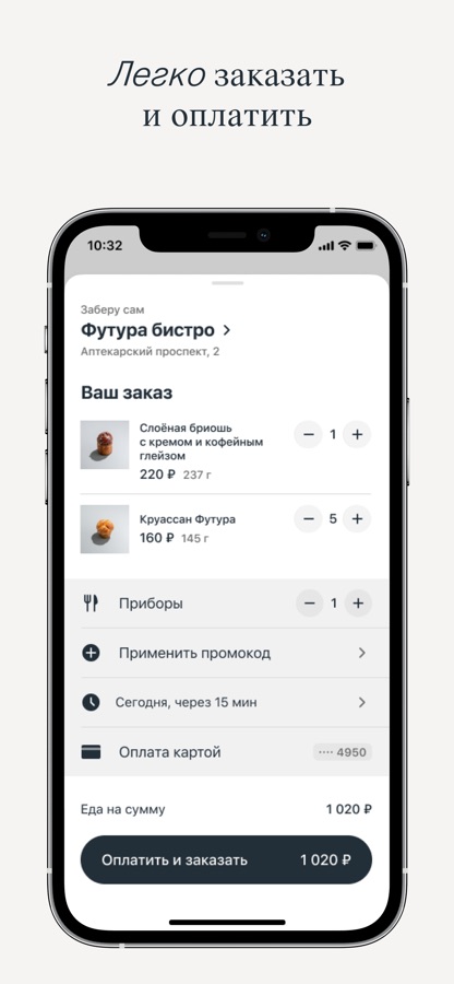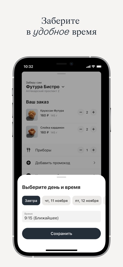 Вы можете заранее сделать заказ и прийти за ним в ФУТУРА бистро, пекарню или угол. Статус заказа подскажет приложение.
