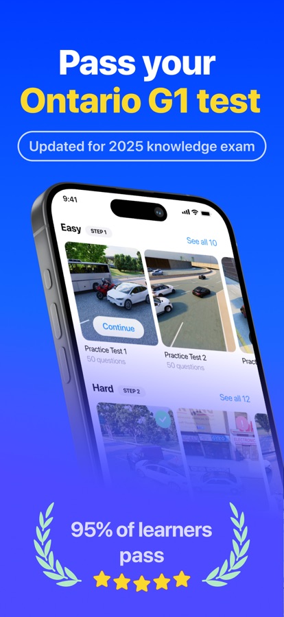 Join thousands of Ontario learner drivers who passed their G1 written test using this app. With G1 Genie, you’ll breeze through your exam and walk out of the DriveTest center feeling like you just took a first-grade spelling test.