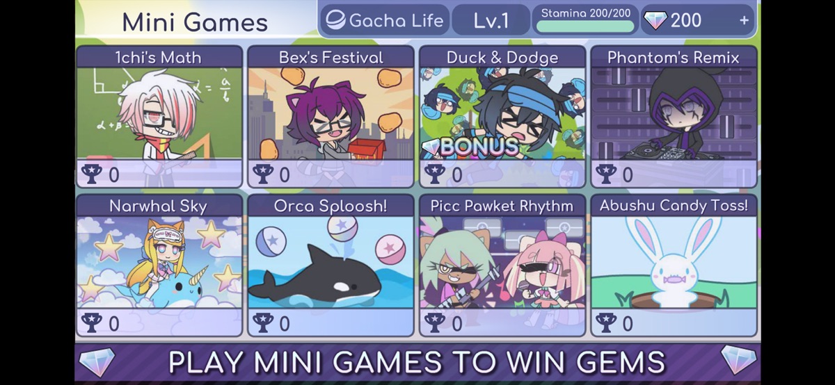 Когда нужно отвлечься от творчества, Gacha Life предлагает 8 мини-игр. Duck & Dodge проверяет реакцию, Phantom’s Remix тренирует чувство ритма, другие режимы соревнуются в ловкости и скорости. За успехи в играх Gacha Life начисляет самоцветы — внутреннюю валюту, которую можно потратить в гаче. Самоцветы выпадают независимо от результатов, так что фарм остаётся честным и не требует доната. На iOS мини-игры работают с тактильной отдачей, что добавляет ощущения при столкновениях и точных тапах.