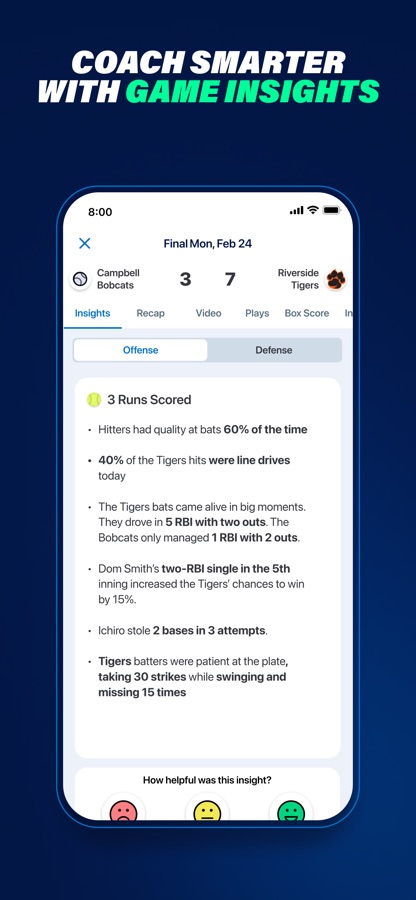 Baseball, softball, and basketball players can showcase individual stats and key video highlights on customizable athlete profiles that can be shared with family, friends, or recruiters. (Paid subscription required for fans.)