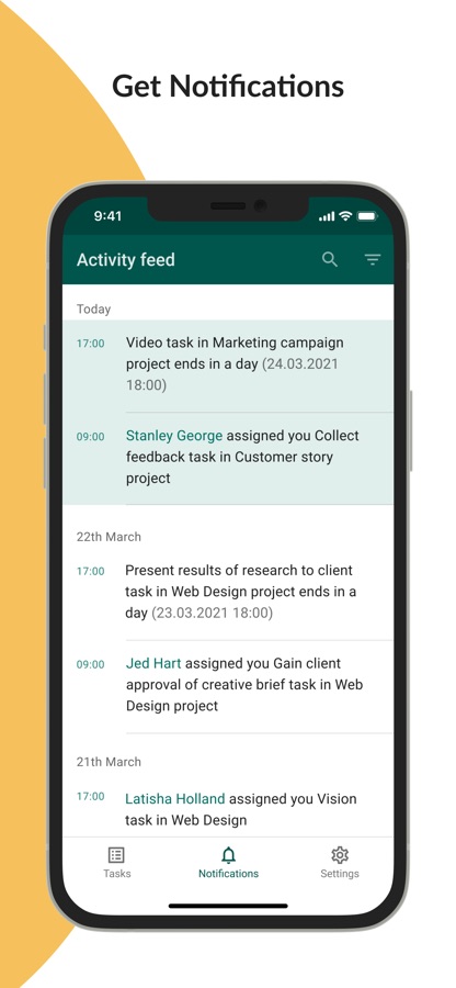 Включайте уведомления и получайте мгновенную информацию о задачах. Будьте в курсе дат начала и завершения, а также дедлайнов. Знайте, когда кто-то отметит вас, оставит комментарий или файл.