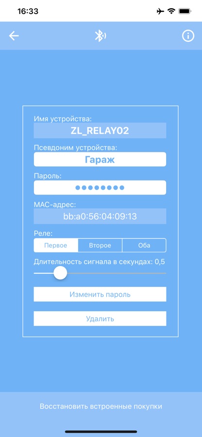 Приложение также предлагает возможность индивидуально настраивать длительность сигнала и номер используемого реле. В случае двойного гаража с двумя воротами оба реле могут управляться отдельно. В этом случае появятся две кнопки: одна для ворот 1 и одна для ворот 2.