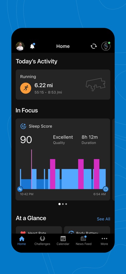 После сопряжения смартфона(1) с устройством Forerunner®, Venu®, Fēnix® или другим совместимым устройством Garmin(2)вы сможете просматривать отслеживаемые занятия и показатели состояния здоровья. Кроме того, вы сможете создавать тренировки, строить дистанции и соревноваться с друзьями в таблице лидеров.