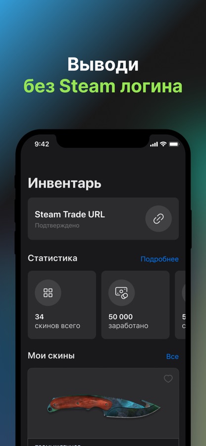 Основная миссия нашей команды – предоставить каждому CS:GO игроку возможность играть с красивыми скинами бесплатно. С помощью нас вы получите ещё больше удовольствия от игрового процесса. В приложении доступно более 600 видов скинов, мы следим за всеми обновлениями нашей любимой игры и обновляем пул скинов так скоро, как это возможно. Вывод осуществляется по trade-URL. Это безопасно, потому что логин Steam не потребуется ни на одном из этапов работы с приложением.