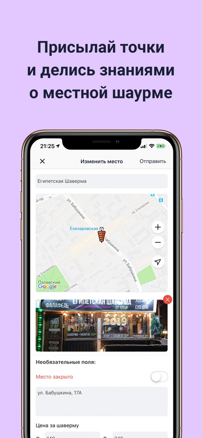 — Возможность прислать заведение. Поделитесь своими знаниями о местной шаурме, шаверме или донере