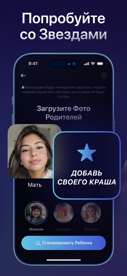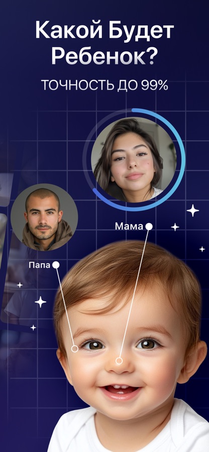 Сгенерируйте лицо ребенка: Одним касанием наш ИИ анализирует фотографии и комбинирует черты лица, чтобы сгенерировать прогноз о лице вашего будущего ребенка.