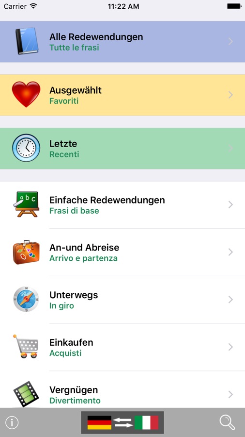 Thanks to the multiplicity of its lexicon, the German to Italian phrasebook and translator is really indispensable for a traveller: the included phrases have been specifically selected for tourism and for short — middle term stays. The interface has been designed to be easily readable: the translated phrase is highlighted in red, so all you have to do in order to communicate is to show the screen of your device, and you will be understood in no time!