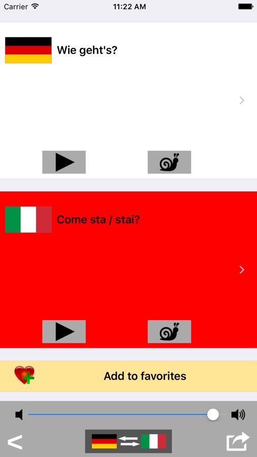 The German to Italian phrasebook and translator is also useful for language learning / improvement: you can save the phrases in a favorites section for easy access, and use them later to train yourself with the pronunciation.