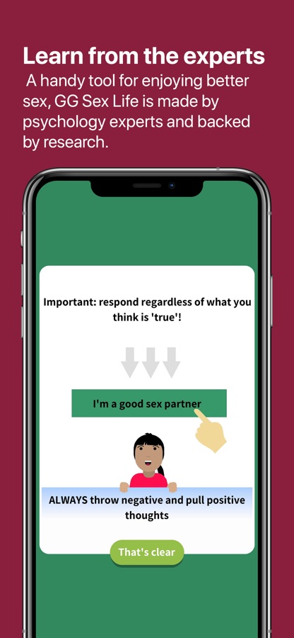 Training using this application, allows for gradual, steady learning of more adaptive self-talk thereby helping to break the vicious thought cycle maintaining low sexual self-esteem.