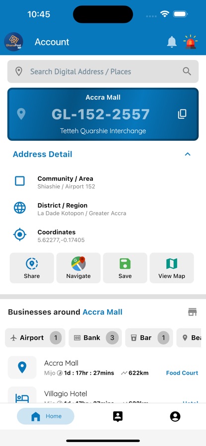 The digital address is a composite of the postcode (region, district & area code) plus a unique address. GhanaPostGPS translates your GPS location to a user friendly digital address. With GhanaPostGPS,