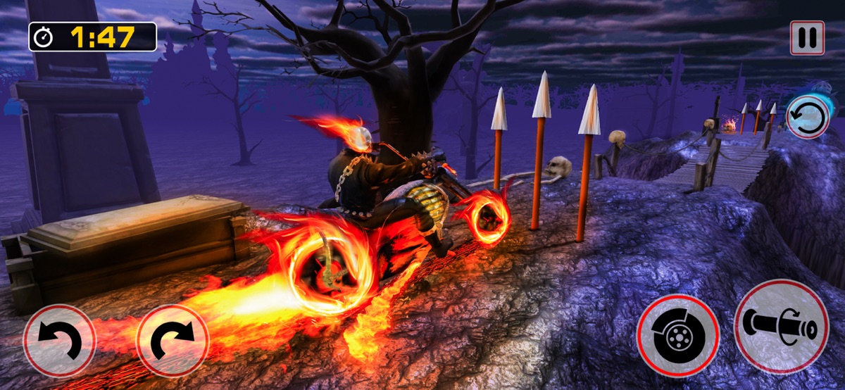 Добро пожаловать в захватывающую игру Ghost Bike Rider и исследуйте темные трассы подземного мира Devils Moto, где вы можете играть в качестве 3D-симулятора скелетных гонок. Прыгайте по заоблачным шорт-трекам, выполняя смертоносные трюки на мотоциклах, разгоняйтесь по сумасшедшим мега-рампам, заполненным различными необузданными препятствиями, такими как молоты и огненные шары, которые готовы атаковать вас. Гоняйте быстро по удивительным ухабистым трассам и петлям в этой экстремальной гоночной игре. Мчитесь через горящие круги, преодолевайте опасности и сокрушайте своих заклятых соперников, как профессиональный гонщик, мастер трюков в этих экстремальных играх со смертью.