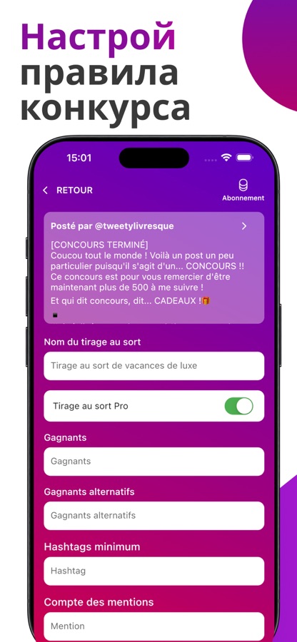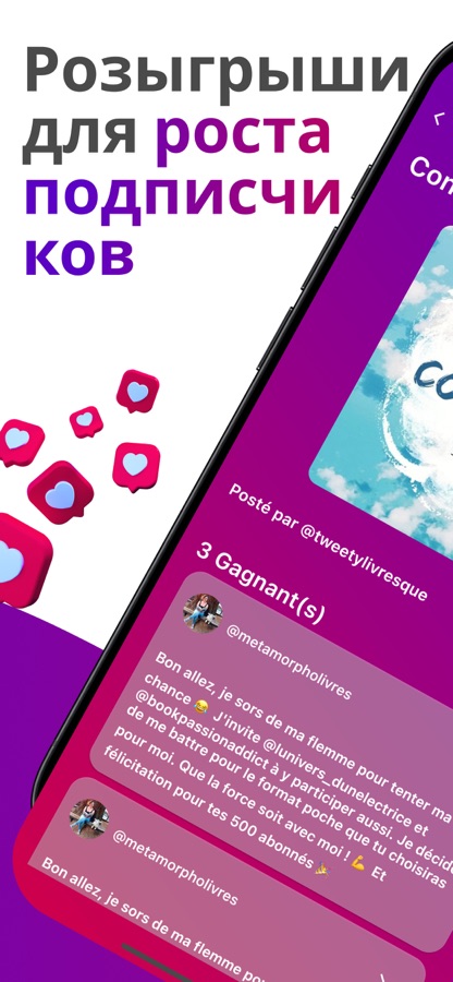 Вы можете организовывать розыгрыши, случайным образом выбирать и объявлять победителя с помощью нашего приложения.