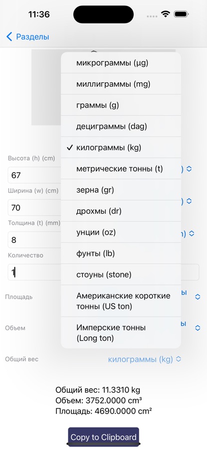 Гибкие единицы измерения: Теперь вы можете выбрать предпочитаемые вами единицы измерения для длины, площади, объема и веса. Мы поддерживаем широкий спектр единиц, включая, но не ограничиваясь миллиметрами, дюймами, футами, ярдами, квадратными дюймами, квадратными футами, кубическими миллиметрами, кубическими футами и различными единицами веса от граммов до тонн.