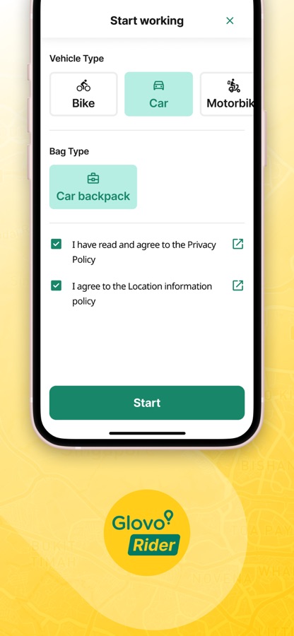 Чтобы начать, загрузите приложение Glovo Rider и зарегистрируйтесь в качестве курьера. Опыт доставок не требуется.