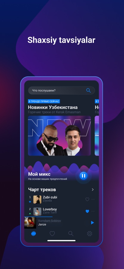 Тематические плейлисты на любой музыкальный вкус: узбекская музыка, русская музыка, рок, поп, рэп, хип-хоп. Слушайте музыку в зависимости от своего настроения, для вдохновения, мотивации, в тренажерном зале, на работе. Музыкальные подборки на любые случаи жизни. Слушайте музыку оффлайн и не расходуйте интернет-трафик. Музыка бесплатно для всех в течение пробного периода.