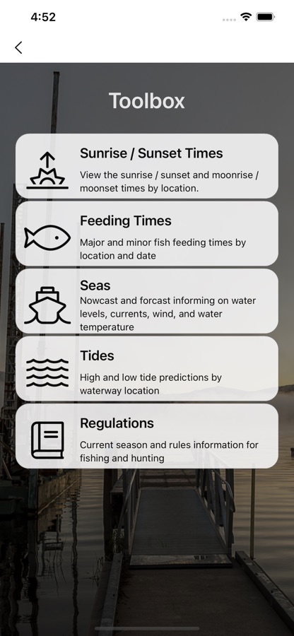 — Access to hunting and fishing regulations, season and bag limit information, and state record fish