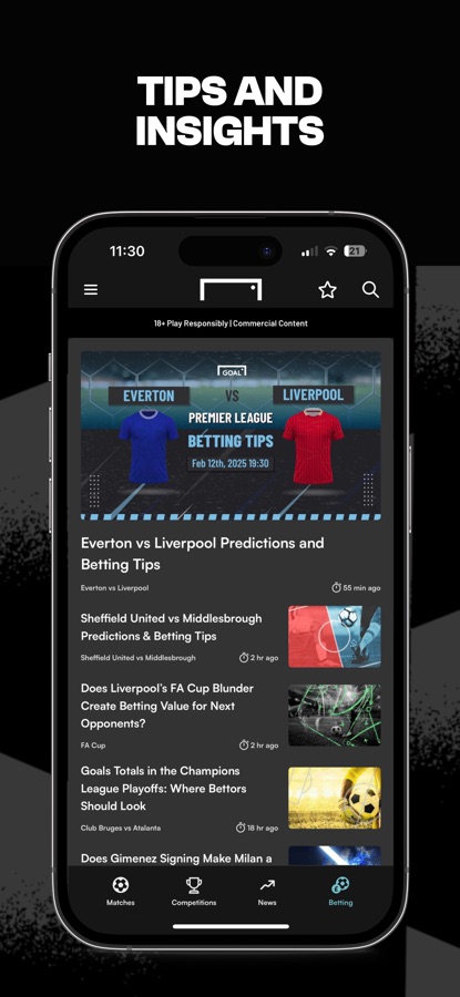 GOAL Live Scores is the ultimate football hub for all your match-day scores and betting needs. With real-time scores, up-to-the-minute stats, and exclusive access to the latest odds and offers, our app provides a one-stop-shop for all of the needs of a football fan on a match-day. Our redesigned betting hub delivers everything you need: Match specific odds, top betting tips, and exclusive offers across all the major leagues, so you never miss a winning opportunity. Even better — personalised updates and notifications put you in control of your favourites. GOAL Live Scores immerses you in the world of football, enhancing the experience for fans across the globe.