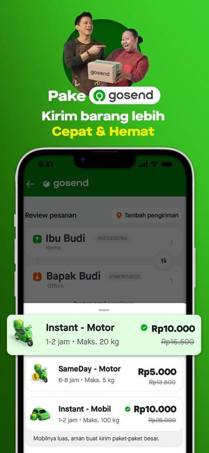 Buat kebutuhan pengiriman, kamu bisa pakai GoSend, atau GoBox kalau barang yang kamu kirim banyak atau besar-besar.