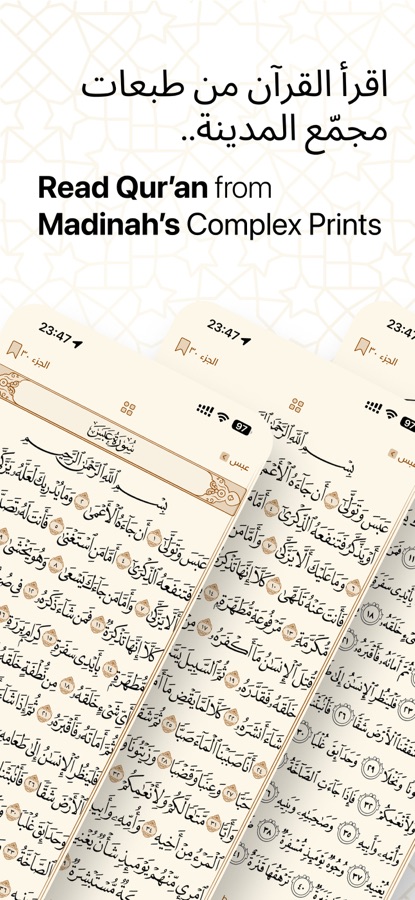 ٢. يوفر التطبيق تلاوة المصحف بثلاث روايات: حفص عن عاصم، وورش عن نافع، وقالون.