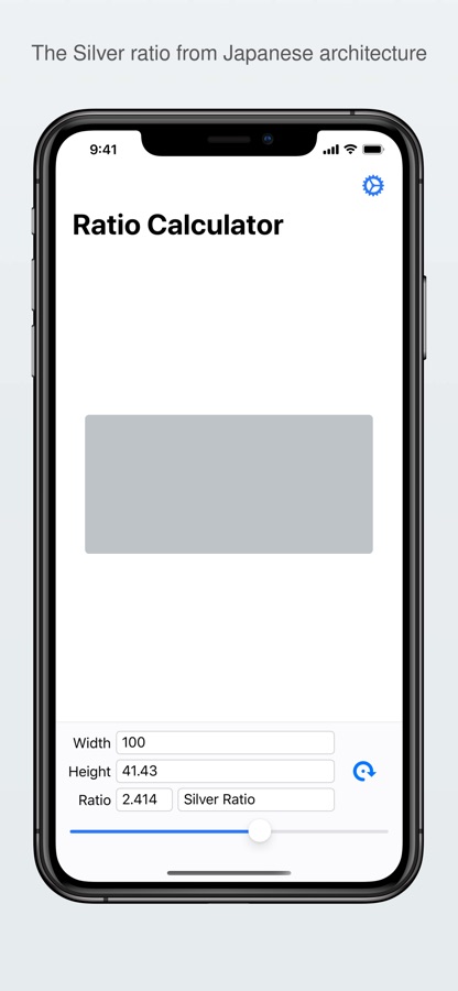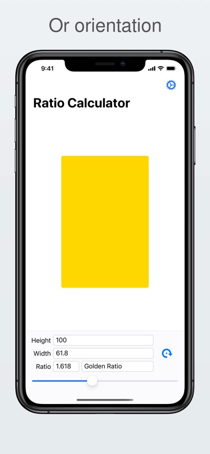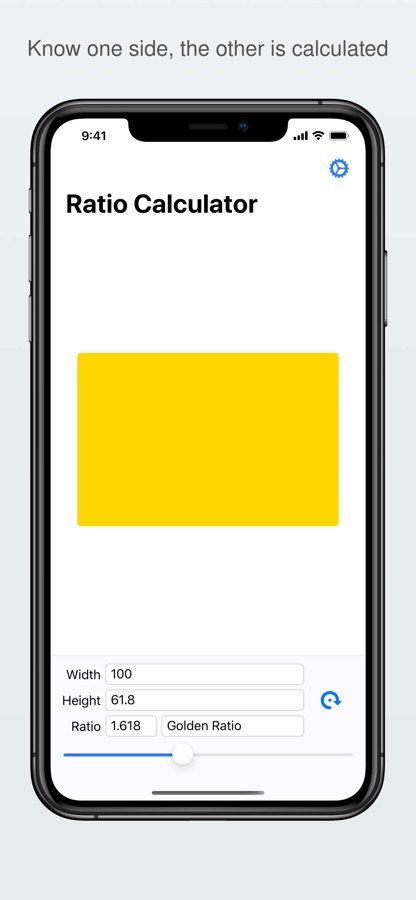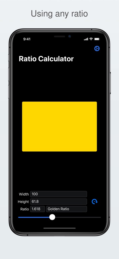 Type in width or height, pick a ratio, and the app gives you the matching value right away. Start with the golden ratio, or jump to Silver, Bronze, Yamato, HD Video (16:9) and Old Television (4:3). If none of those fit, dial in your own custom ratio with the slider or type it in directly.