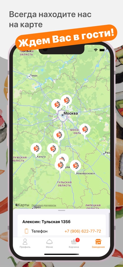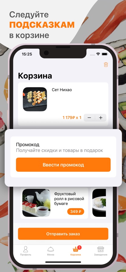 Как сделать заказ в приложении “GOLDFISH”: выберите понравившиеся позиции из меню, добавьте их в корзину и перейдите на экран оформления заказа (по нажатию на иконку корзины).